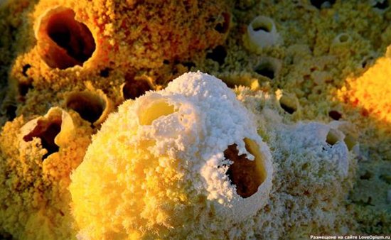 В результате деятельности гейзеров появляются соляные конусы и серные пузыри: