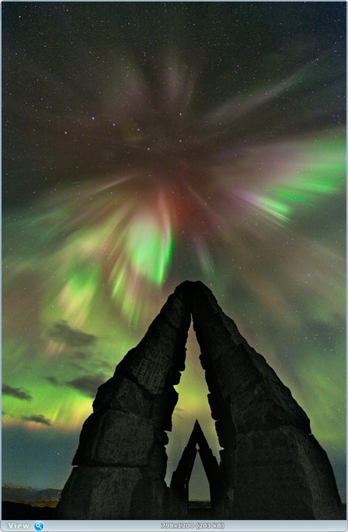 На этой картинке все выстроилось в одну линию, даже без разноцветного северного сияния высоко в небе. На фотографии запечатлен недавно построенный "Арктический Хендж" в Рауфархофне в северной Исландии. Если продолжить линию, соединяющую вершины монументов, то вы увидите, что она указывает на север. Убедиться в этом очень просто: хорошо видно, что линия проходит через две крайние звезды Большого Ковша – Мерак и Дубхе, и дальше – к яркой Полярной звезде, которая находится как раз в том месте, где северный конец оси вращения Земли проектируется на небесную сферу. Монумент спроектирован таким образом, что с этой точки зрения та же самая линия пройдет через полуночное Солнце, когда оно выше всего поднимается над горизонтом – в день летнего солнцестояния в северном полушарии Земли. Другими словами, во время летнего солнцестояния в конце июня Солнце не зайдет над "Арктическим Хенджем". Достигнув наивысшей точки на небе, оно будет прямо над вершинами этого современного монумента. Эта фотография была сделана в конце марта, когда небо украсило прекрасное северное сияние.