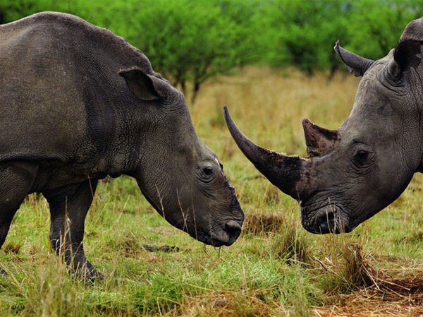 Носороги, ЮАР. Самка белого носорога (слева) пасется в компании самца. Браконьеры, сидевшие в вертолете, выстрелили в нее и ее месячного детеныша ампулами со снотворным, после чего отпилили ее рога бензопилой.