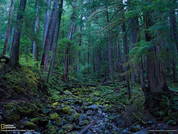 Таинственный лес. Деревья с большим разнообразием мха, папоротника и лишайника в Национальном парке Олимпик, США.