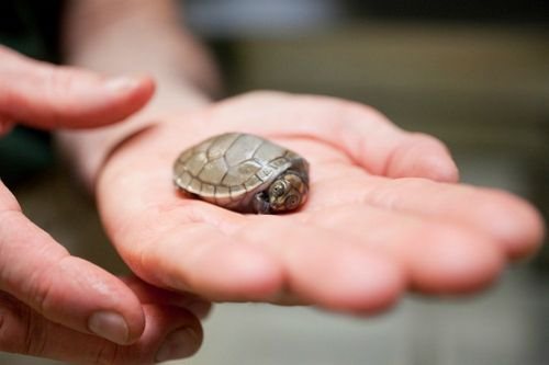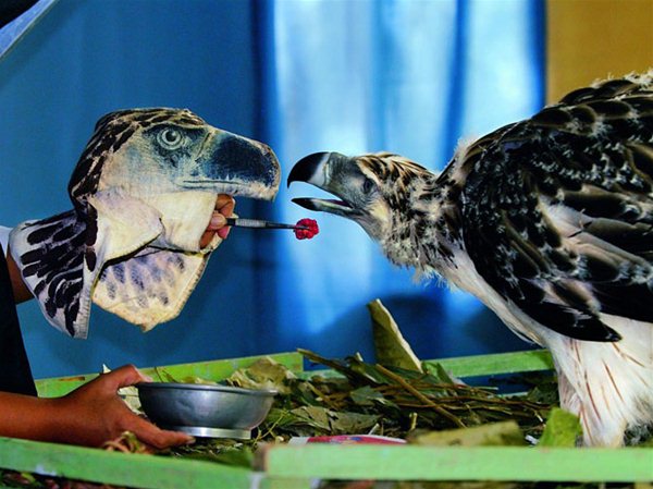 Филиппинский орленок. Участники программы по разведению орлов в неволе надевают на руки игрушечные орлиные головы, чтобы птенцы не принимали людей за своих родителей.