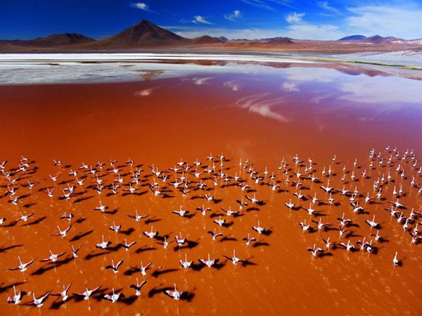 Лагуна-Колорада. Озеро с горячими источниками, окрашенное водорослями в красноватый цвет, облюбовали фламинго.
