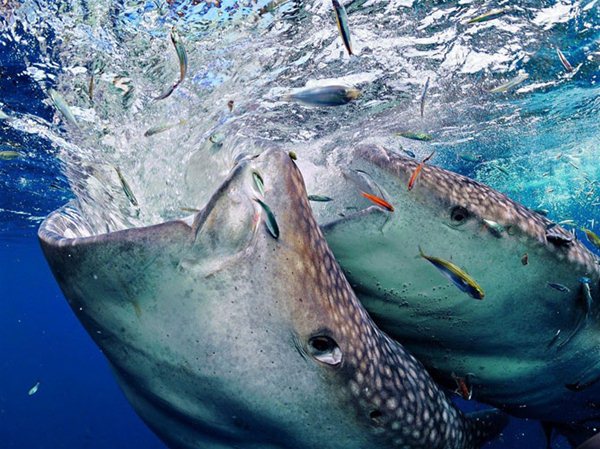Китовые акулы. Самцы китовых акул дерутся за еду. Взрослая акула может день и ночь безостановочно плыть со скоростью от 1.5 до 5 км/час, попутно питаясь.