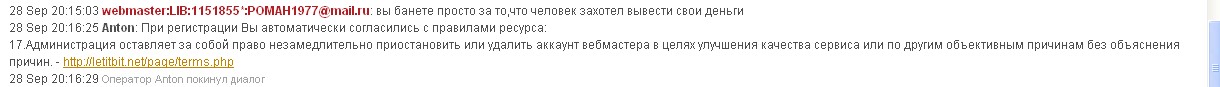 | Quote (Ромео) Letitbit.net банит акки без доказательств и обьяснений бана.По моему мнению они банят просто за то,что люди хотят вывести свой деньги. На прикреплённом файле скрин того, как они беспредельничают.